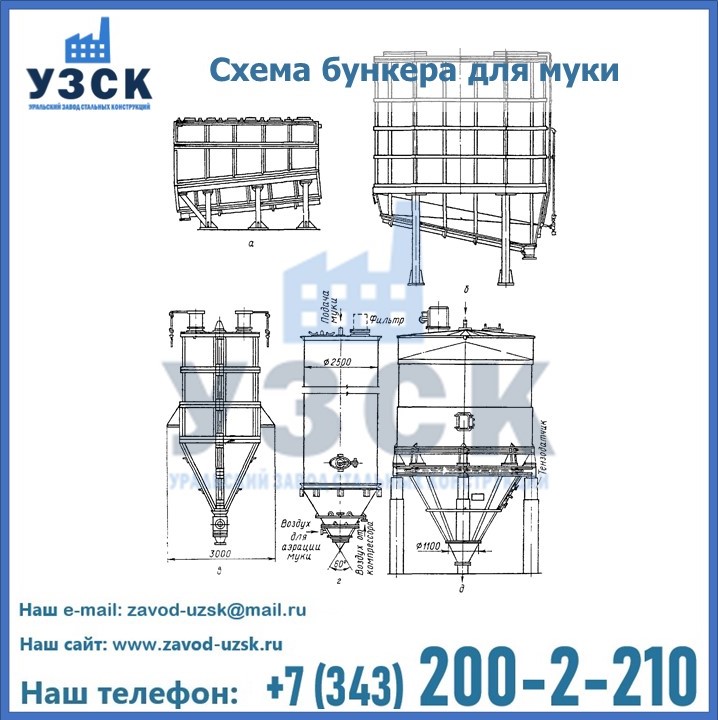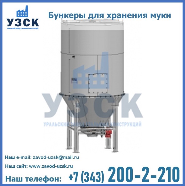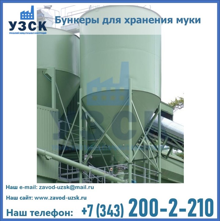 Завод «УЗСК» в Екатеринбурге проектирует, производит и поставляет целевое оборудование, в том числе, бункеры для хранения муки и прочих сыпучих материалов.