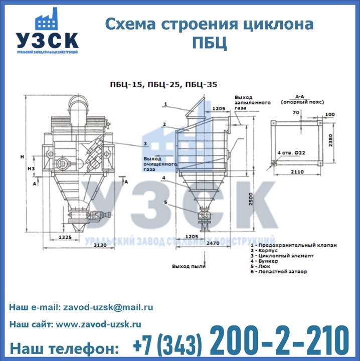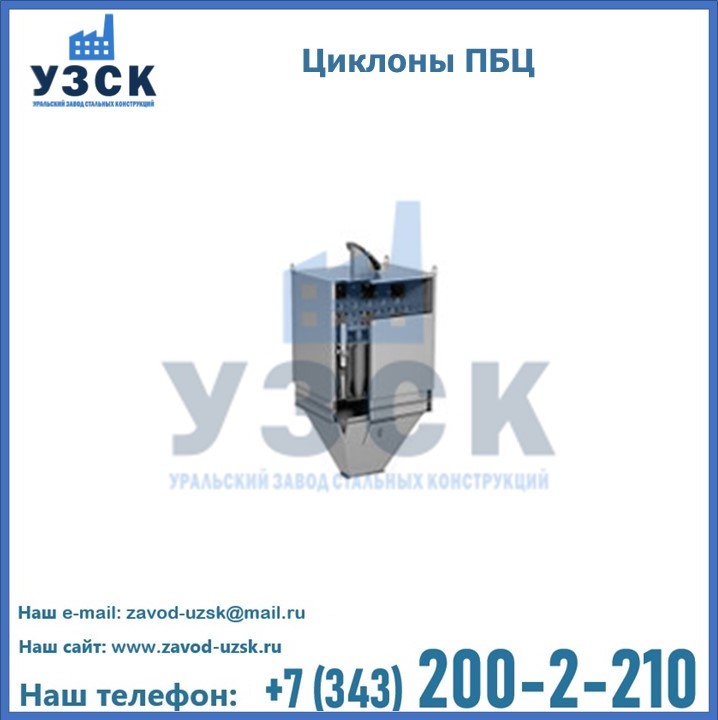 Завод «УЗСК» в Екатеринбурге предлагает приобрести циклоны ПБЦ и прочие устройства, полностью укомплектованные и готовые к эксплуатации. Мы гарантируем соответствие оборудования всем требованиям ГОСТ и ТУ, износостойкость и высокую производительность предлагаемого оборудования. Уральский Завод Стальных Конструкций изготавливает и продает надежное, эффективное и производительное оборудование, имеющее длительную гарантию и большой эксплуатационный ресурс. Если требуется изготовить циклон нестандартных размеров, то такой вариант выполнения заказа тоже предусмотрен, так как предприятие имеет собственные производственные площади и надежных поставщиков. На все поставляемое или производимое оборудование имеются чертежи и прочая техническая документация. Заказать и купить циклоны или прочее оборудование высокого качества и по доступной цене можно через наш сайт или по указанному в разделе «Контакты» телефону.