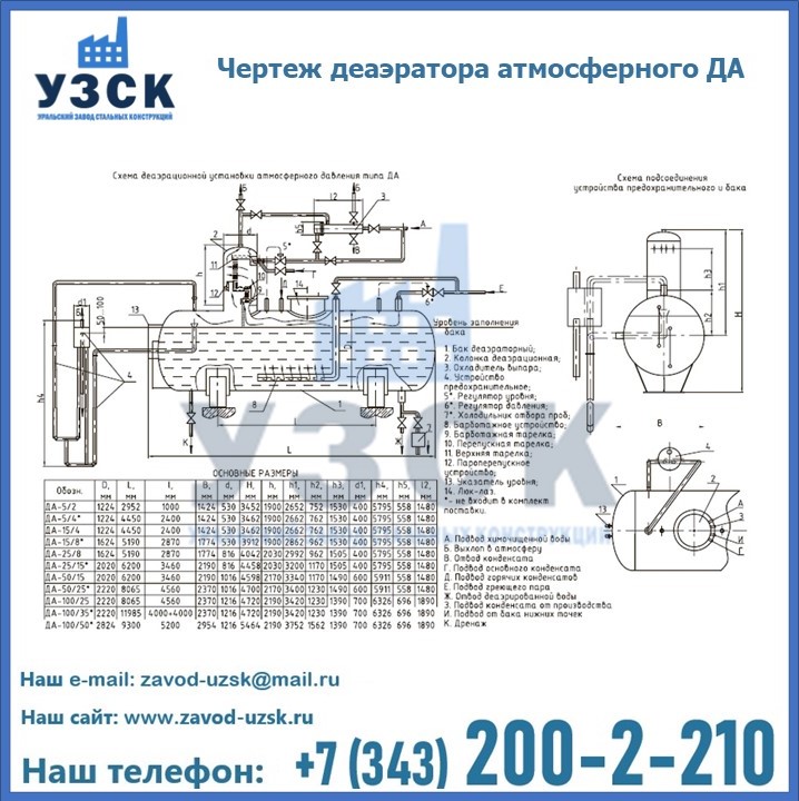 Приобрести качественное оборудование, в том числе, деаэраторы ДА, можно в компании УЗСК в Екатеринбурге. Мы предлагаем долговечную и надежную продукцию по приемлемой цене. Заказать и купить деаэраторы или другие изделия высокого качества можно через сайт Уральского Завода Стальных Конструкций, или позвонив по указанному в разделе «Контакты» телефону.